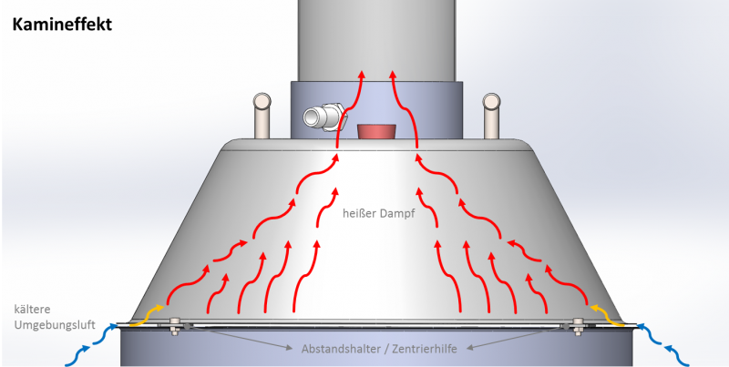 Mit Abstandhaltern wird bei der Brüdenhaube auf dem Einkocher ein Kamineffekt erzeugt. Der heiße Dampf steigt in die Brüdenhaube und nach oben. Der Dampf zieht mittig durch die Haube nach oben, während die kühlere Luft an den Innenwänden nach unten zieht. Der schnell aufsteigende Wasserdampf verursacht Turbulenzen bei der Berührung mit der kalten Luft. Er reißt kalte Luftblasen mit sich, die kalte Luft erwärmt sich und strömt mit hinauf. Die Turbulenzen werden stärker bis sich ein konstanter Strom nach oben bildet. Die Abstandhalter sorgen dafür, dass von unten Frischluft nachziehen kann, um den Effekt zu erhalten.