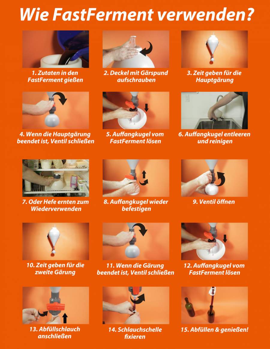 Mit dem konischen Gärbehälter von FastFerment ™ kann endlich in nur einem Gärbehältnis sowohl die Hauptgärung als auch die Nachgärung stattfinden - ein Umfüllen ist nicht mehr notwendig. Darüber hinaus eignet sich der FastFerment ™ bestens dafür, wenn Hefe wiederverwendet werden soll. Zudem kann er durch die mitgelieferte Wandhalterung platzsparend eingesetzt werden und ist natürlich problemlos zu reinigen. Der Nutzinhalt beschränkt sich auf ca. 20-25 Liter. Die hohe Dichte des Polyethylen-Kunststoffes (HDPE) verleiht ihm eine außergewöhnliche Stabilität.