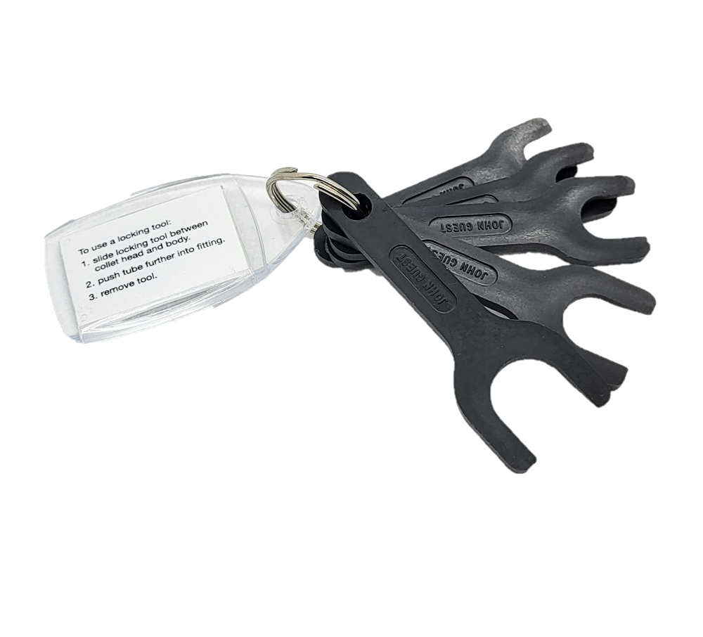 Verriegelungs-Werkzeug in 5 verschiedenen Größen für die (De-)Installation von John Guest Schlauch-Verbindungen.